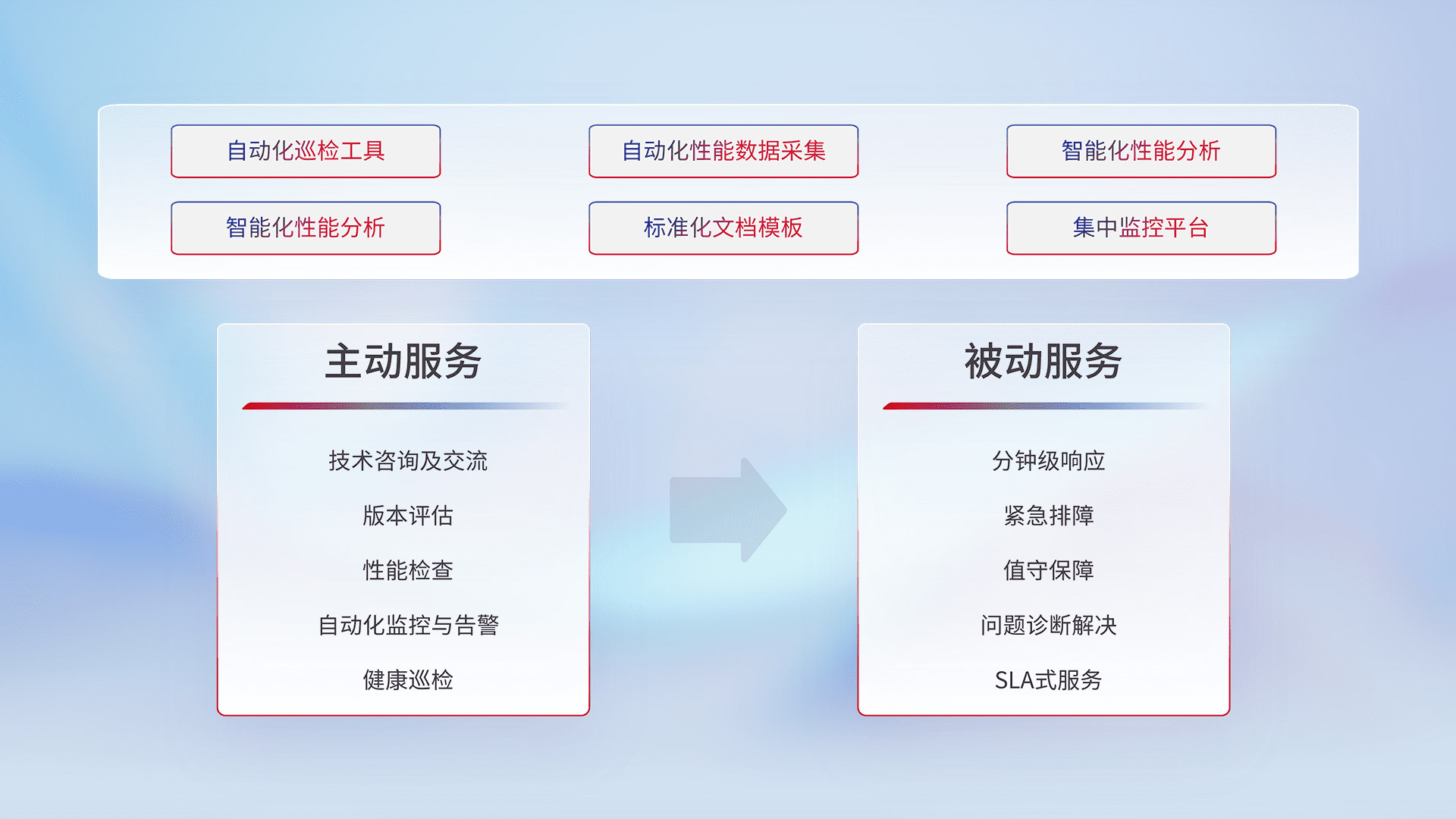 智能化工具和标准化文档,,保障服务质量,,,,提供主动服务(包含技术咨询、、版本评估、、、性能检查、、自动化监控与告警、、、、健康巡检)和被动服务包含(分钟级响应、、、紧急排障、、、值守保障、、、问题诊断解决、、、SLA服务)。。。。